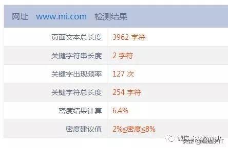 當我們試圖去查詢小米官網,其中“小米”這個關鍵詞密度的時候,我們認為它的關鍵詞密度范圍值是滿足在2%-8%之間的,我們認為,它是在安全范圍之內。